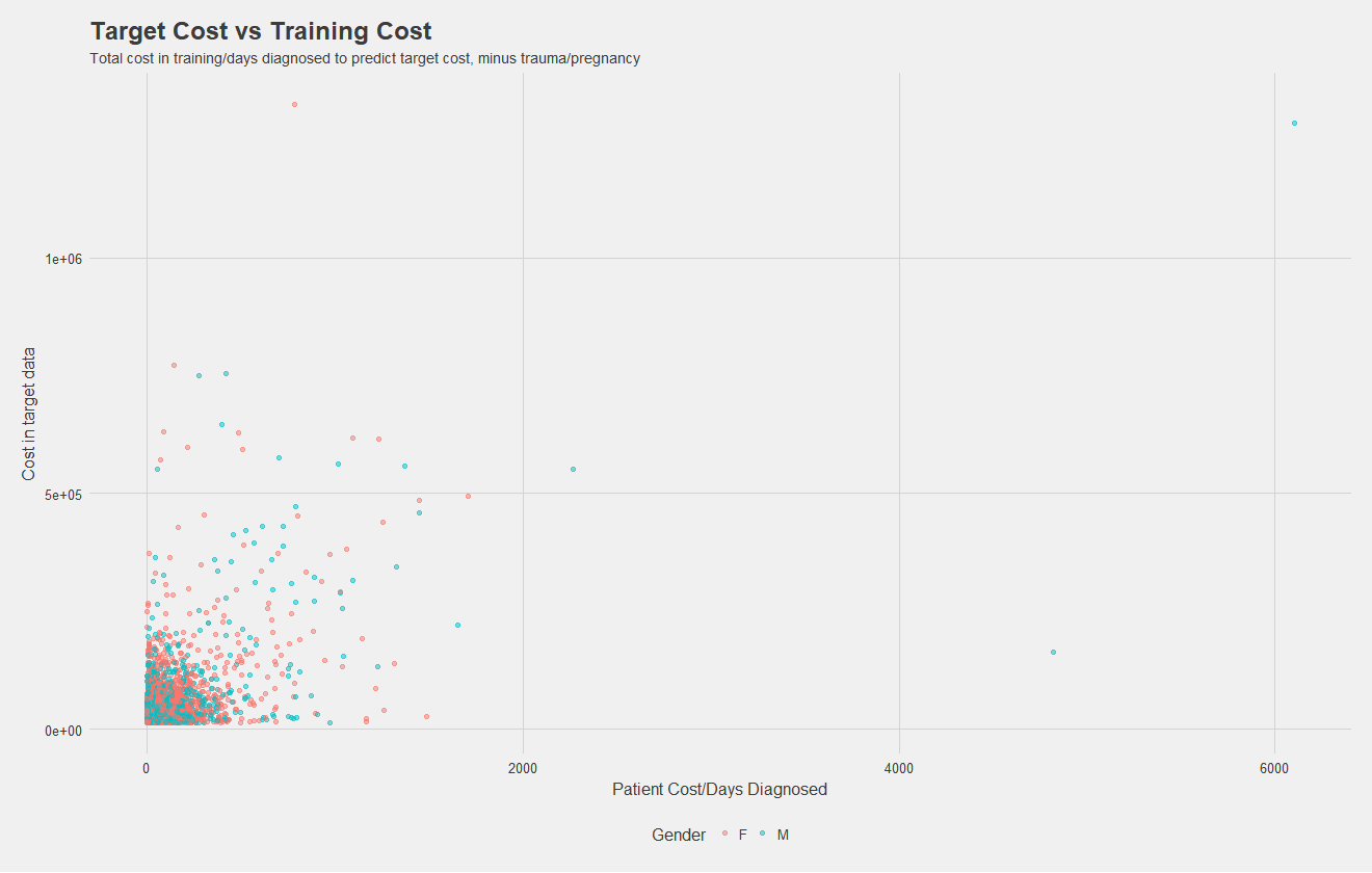 Now, I've simply plotted total costs per patient in the 0-36 month dataset vs costs in the target dataset. While there might not be much of a relationship, this "naive" model alone of grabbing the top 6,000 from the initial dataset to predict the top 6,000 in the future has an accuracy of about 50%! I included this as a factor in my models, and it certainly was the most significant predictor for every group, but feature importance analysis such as that provided in XGBoost would be necessary to know for sure.