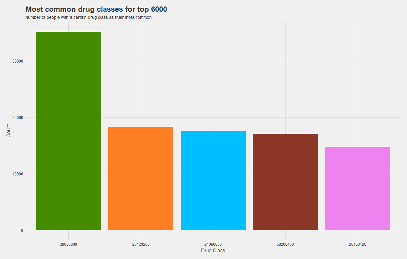 The top graph shows the most common drug classes amongst non-high cost patients, and the bottom graph shows most common drug classes amongst high cost patients. Height indicates the number of patients with that drug class as their most common one, and drug classes are color coded, matching between graphs. It's quite apparent that high cost patients use an entirely different set of drugs which makes them high cost. In fact, only two drugs, the maroon and pink, are shared between groups. The green has near double the prevalance as the next most common for the high cost set.
